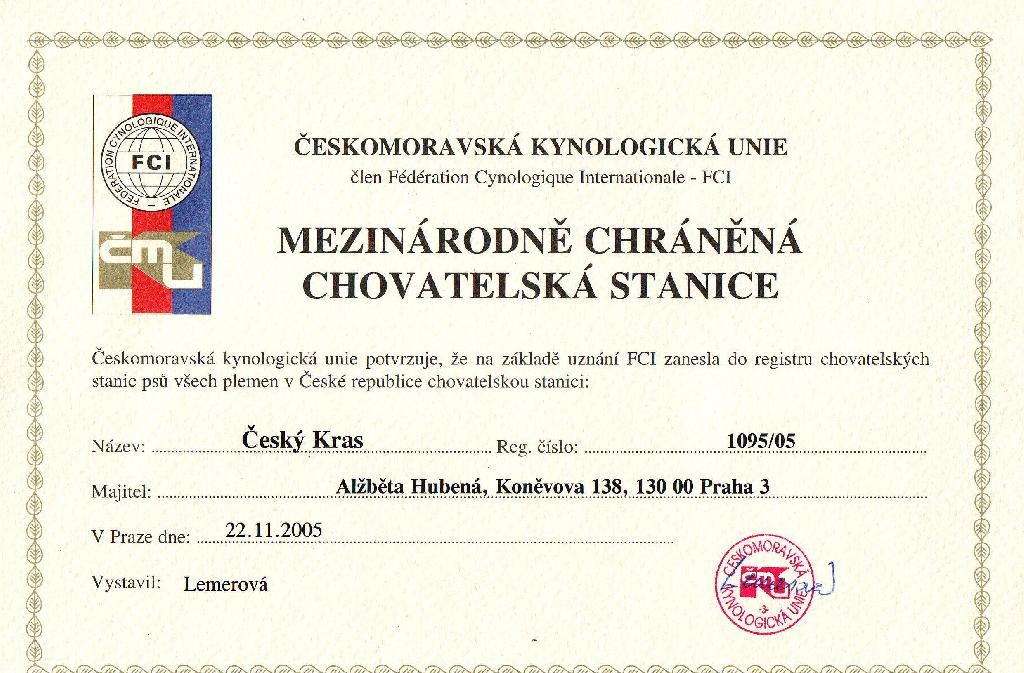 Adresa: Beroun Telefon: +420731065310 Zodpovědná osoba: Alžběta Hubená www: www.kennel-ceskykras.cz Mail: | Reg. číslo CHS: 1095/05 Certifikát CHS: Zobrazit Certifikát ::: Plánujeme vrh: 26.04.2011 Hodnocení: 86 bodů ze 100 |
