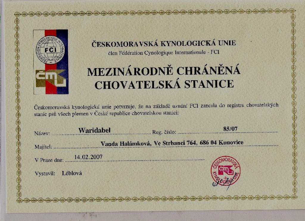 Adresa: Ve Strhanci 764, 686 04 Kunovice Telefon: +420777671973 Zodpovědná osoba: Vanda Halámková www: www.waridabel.wz.cz Mail: | Reg. číslo CHS: 85/07 Certifikát CHS: Zobrazit Certifikát ::: Plánujeme vrh: 28.04.2011 Hodnocení: 88 bodů ze 100 |