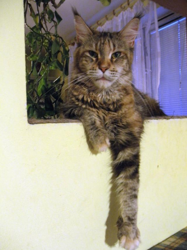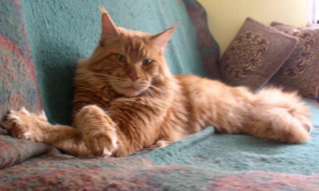 O plemeni:Mainská mývalí kočka je největším zástupcem koček na planetě. Je to přírodní plemeno, které pochází z venkovských usedlostí severního státu Maine - USA. Charakteristickými rysy jsou "rysí" štětičky na uších, mohutná stavba těla, dlouhý huňatý ocas. Často ji zdobí bohatý límec delší srsti na krku. Charakteristické je i její mňoukání, které bývá přirovnáváno k holubičímu vrkání. Vyhovuje jí život v bytě i eventuální možnost poobytu v chráněných venkovních prostorách. Je to nepřehlédnutelný šlechtic mezi kočkami.