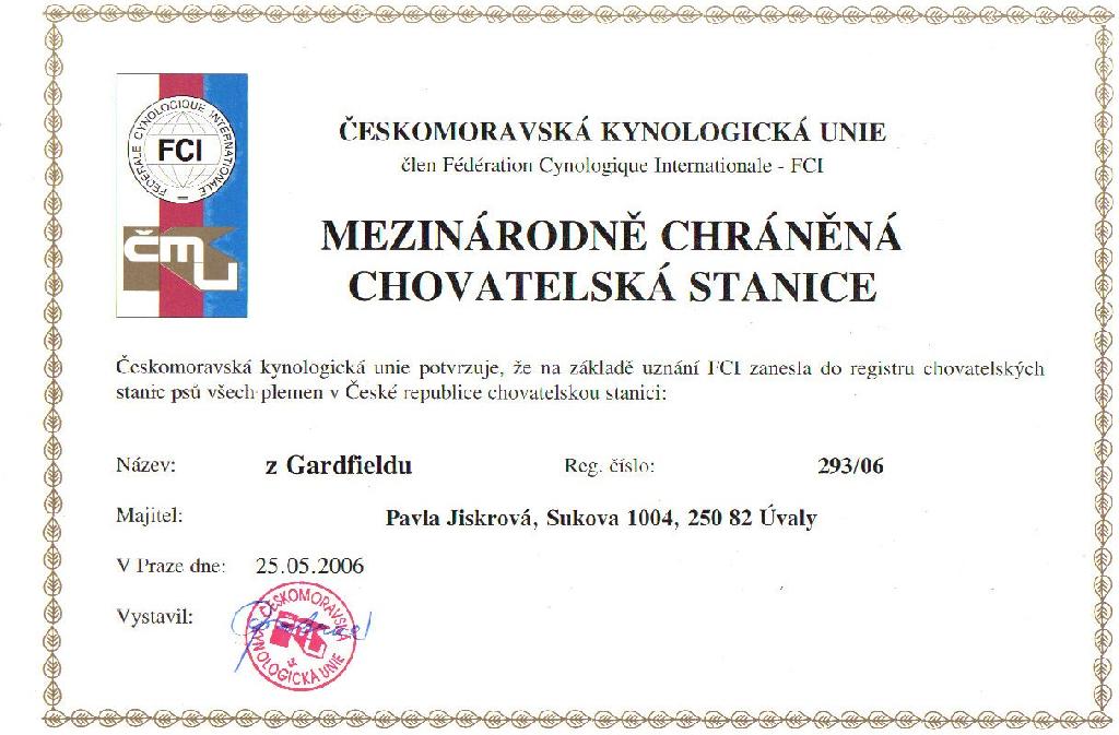 Adresa: Úvaly u Prahy Telefon: +420605458180 Zodpovědná osoba: Jiskrová Pavla www: www.zgardfieldu.cz Mail: | Reg. číslo CHS: 293/06 Certifikát CHS: Zobrazit Certifikát ::: Plánujeme vrh: 20.07.2010 Hodnocení: 80 bodů ze 100 |
