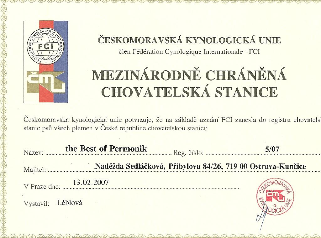 Adresa: Ostrava 19, Přibylova 26 Telefon: +420608661959 Zodpovědná osoba: Naďa Sedláčková www: bestofpermonik.estranky.cz Mail: | Reg. číslo CHS: 5/07 Certifikát CHS: Zobrazit Certifikát ::: Plánujeme vrh: 02.02.2013 Hodnocení: 86 bodů ze 100 |