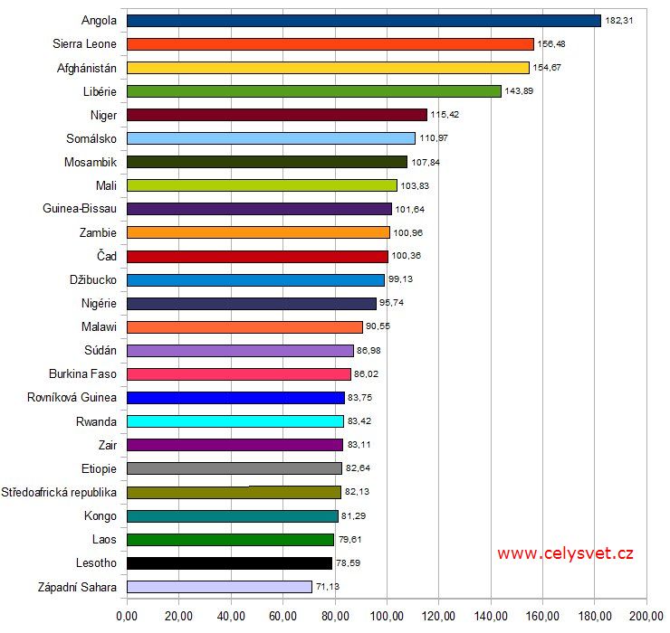 | 1. | Angola ::: | 182.31 úmrtí na 1000 dětí | Vývoj : |